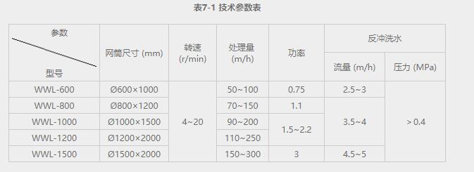 四、外进水微滤机选型参数表: